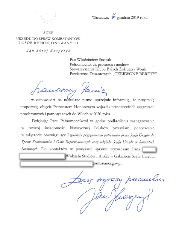 Miło nam poinformować, iż nasz wyjazd w maju na uroczystości obchodów zdobycia Monte Cassino otrzymał patronat Pana Jana Józefa Kasprzyka – Szefa Urzędu do Spraw Kombatantów i Osób Represjonowanych.